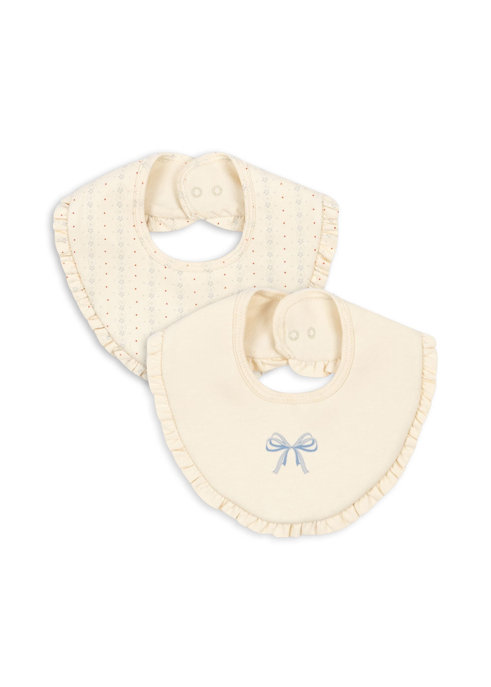 Set of two soft bibs with frills. A practical and cute accessory for babies made from organic cotton.