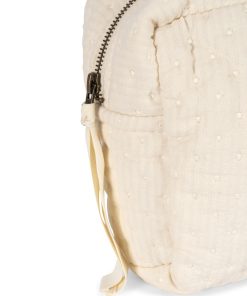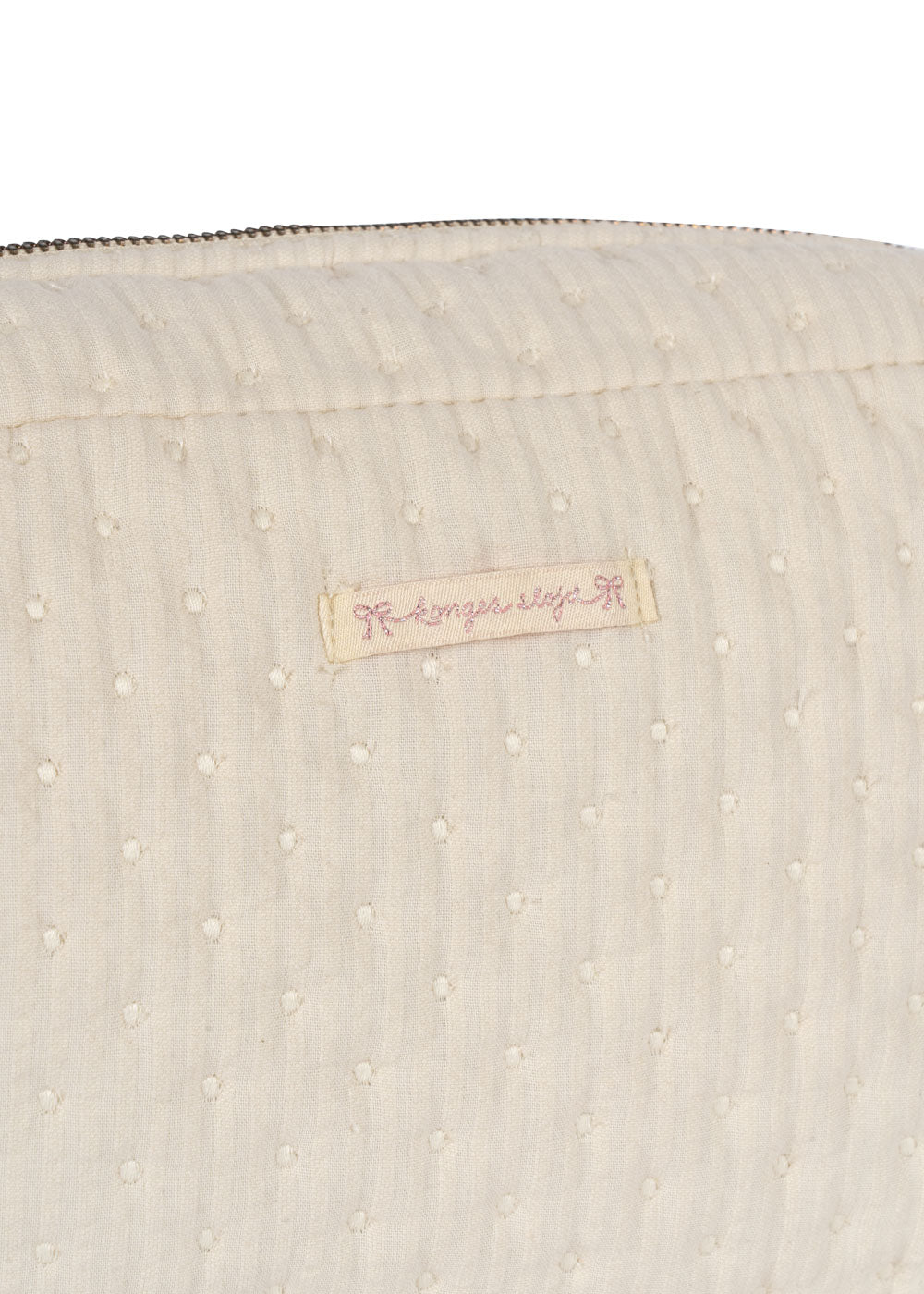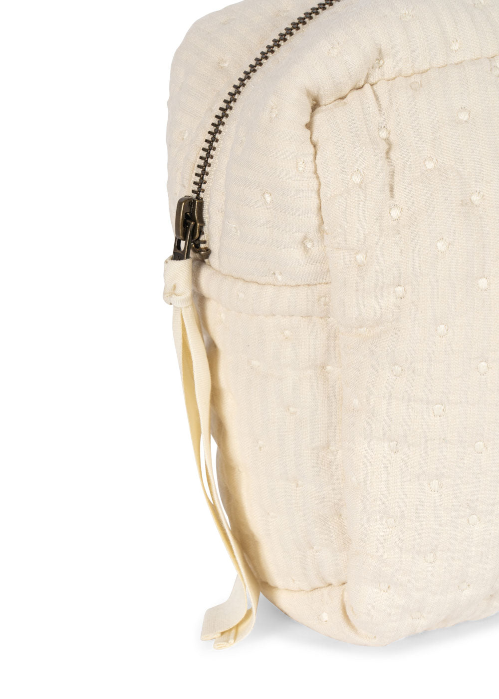 Large quilted toiletry bag crafted from organic cotton. Designed with one big compartment and one smaller inside pocket. Softly padded in order to keep your essentials safe. Closes with an easy zipper.