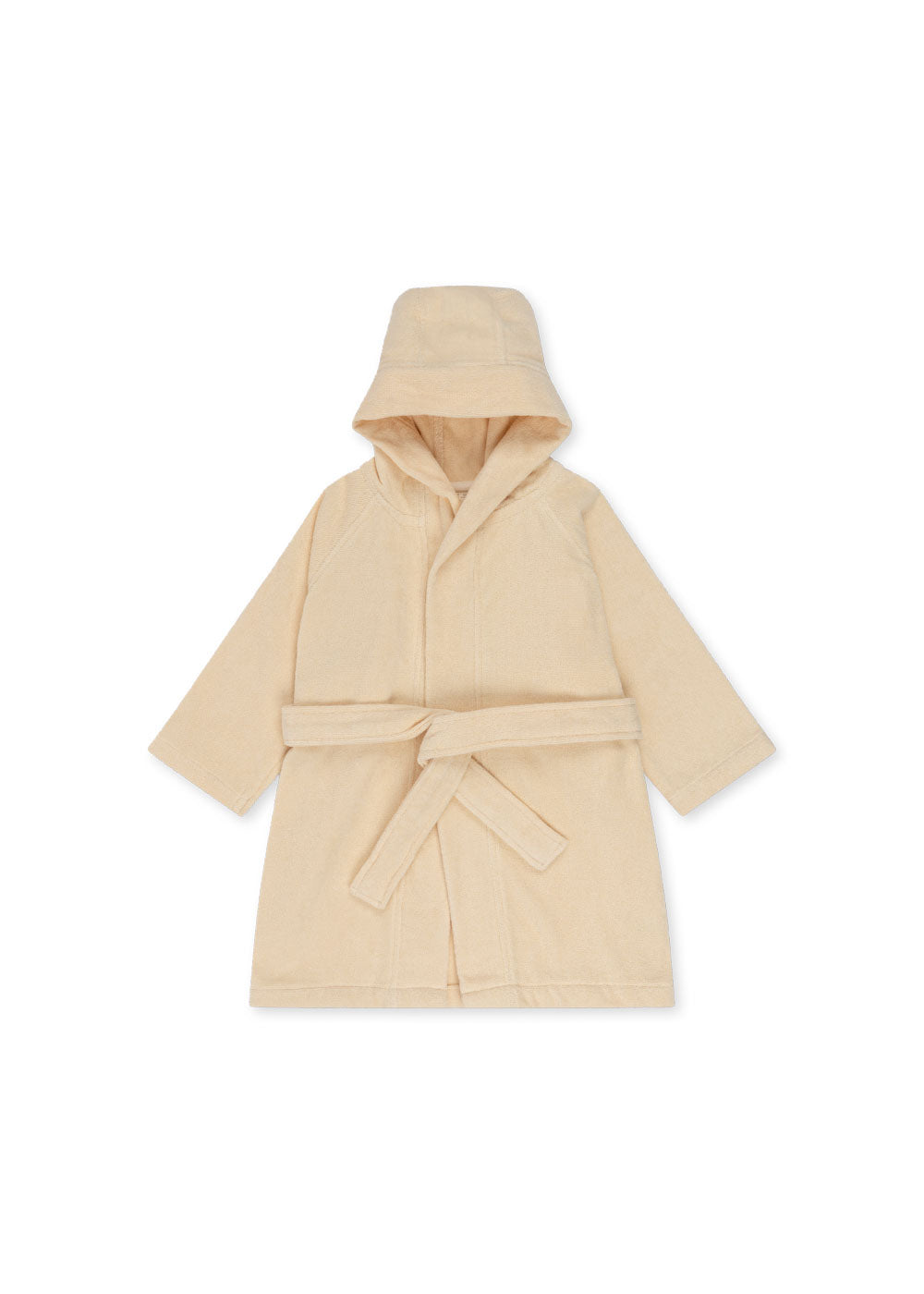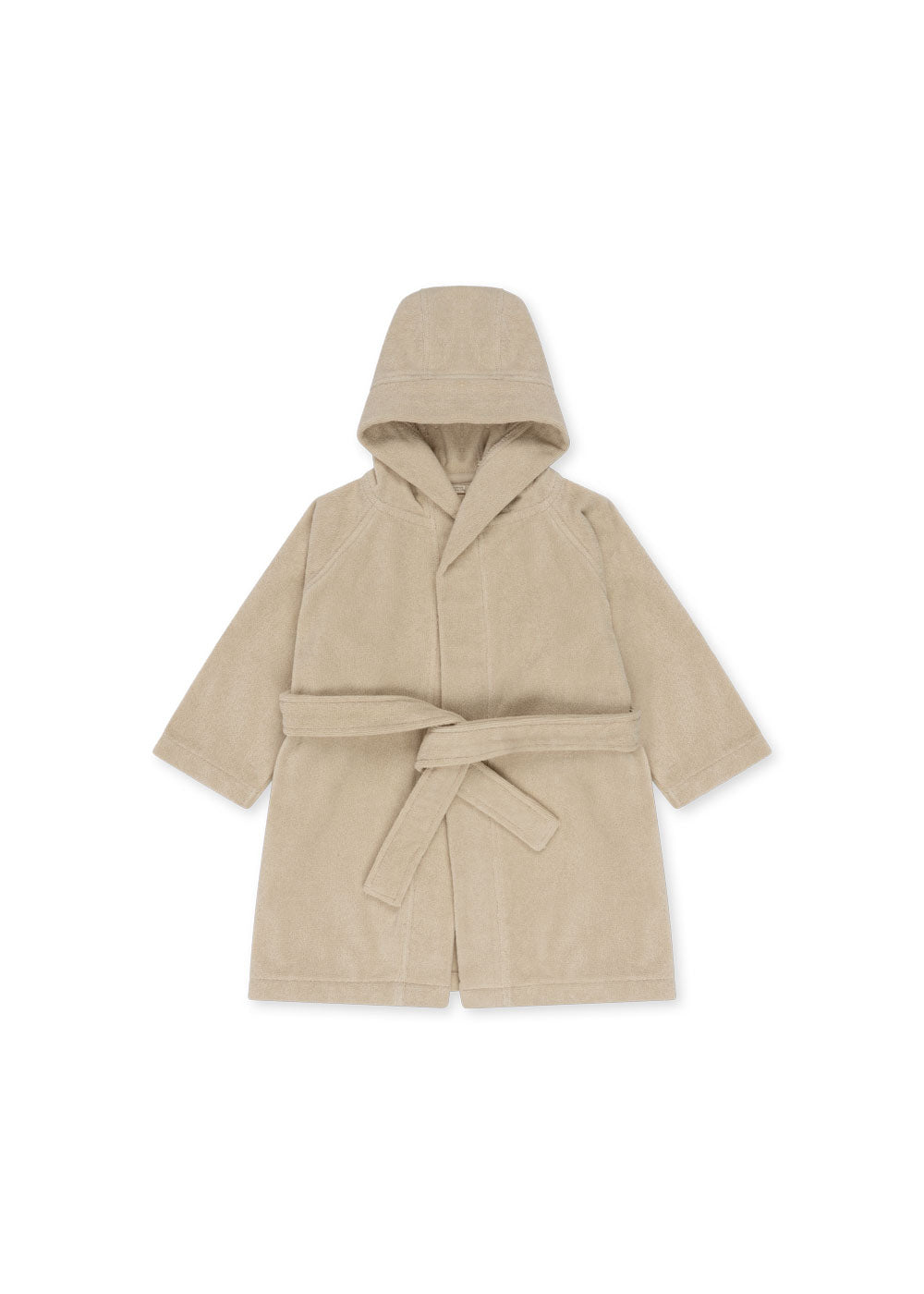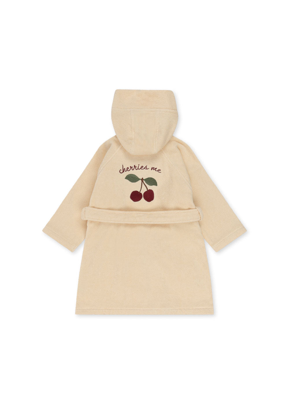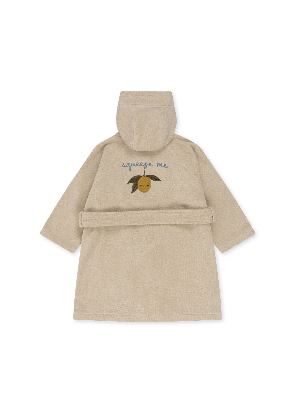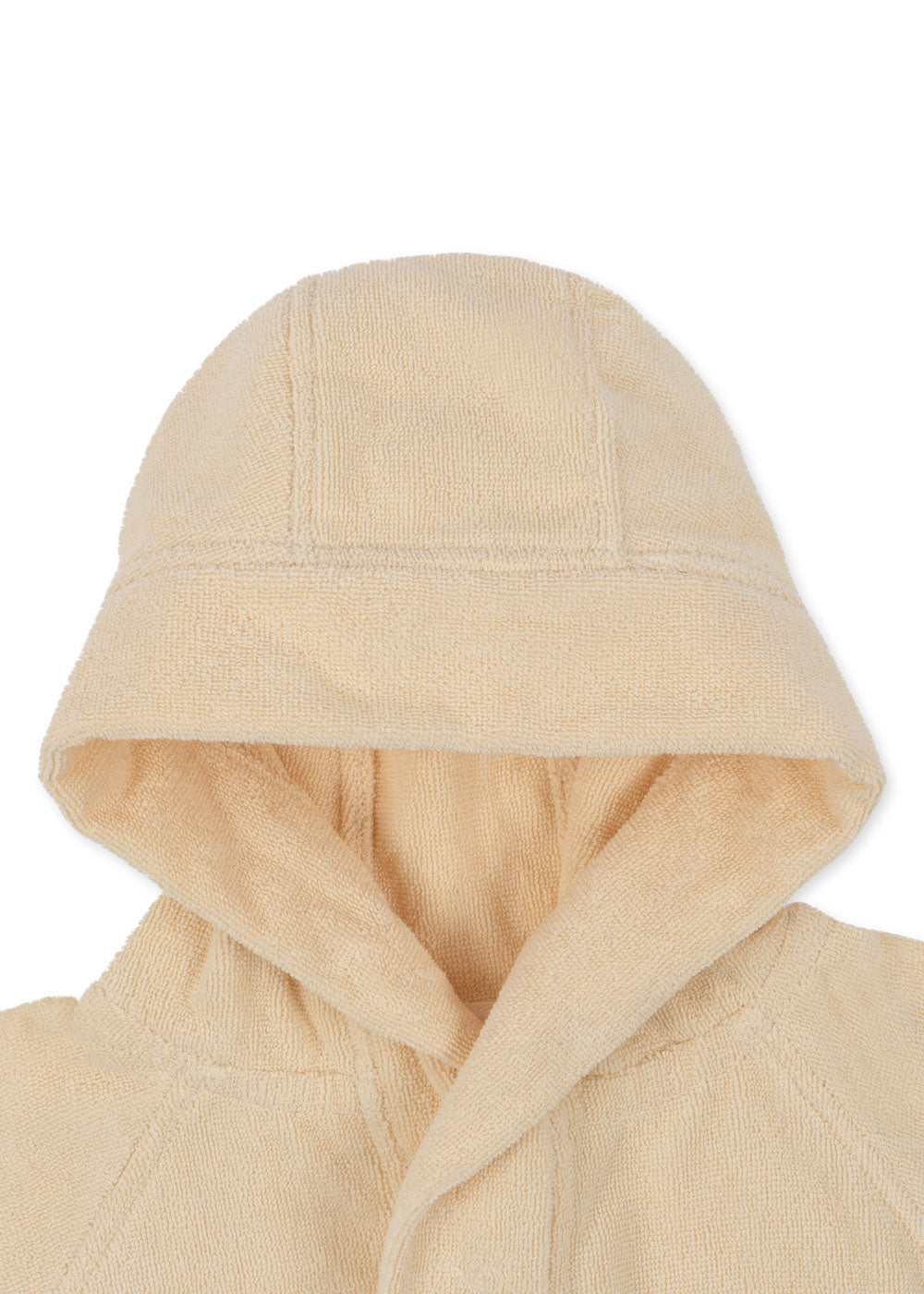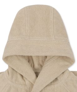 Hooded bathrobe with decorative embroidery and a detachable belt.