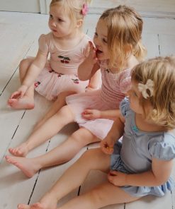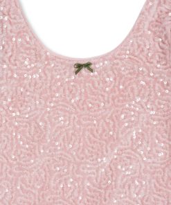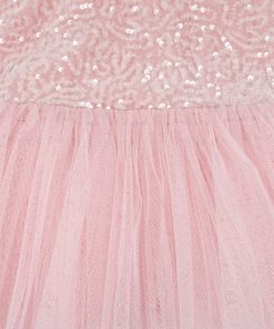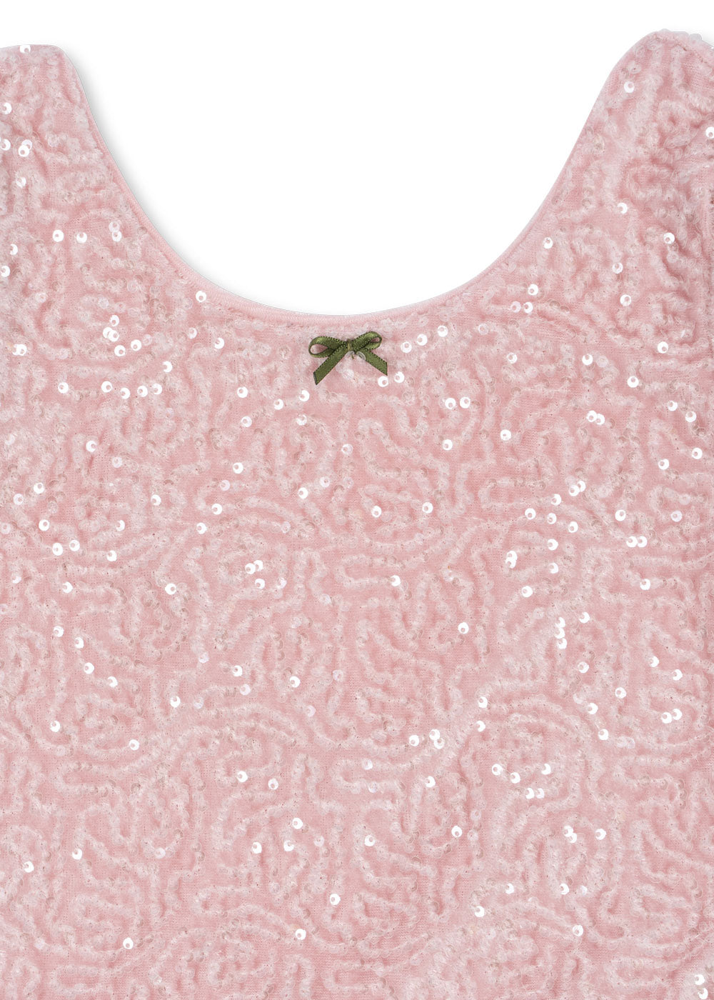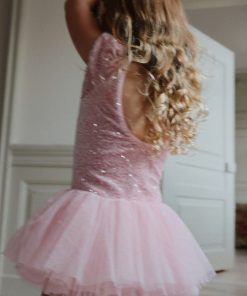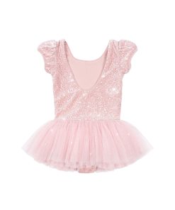 Classic tutu dress for little ballerinas with a low scoop back and puff sleeves. Designed with a voluminous tulle skirt that is attached to a fitted suit in a stretchy performance fabric with decorative sequins.