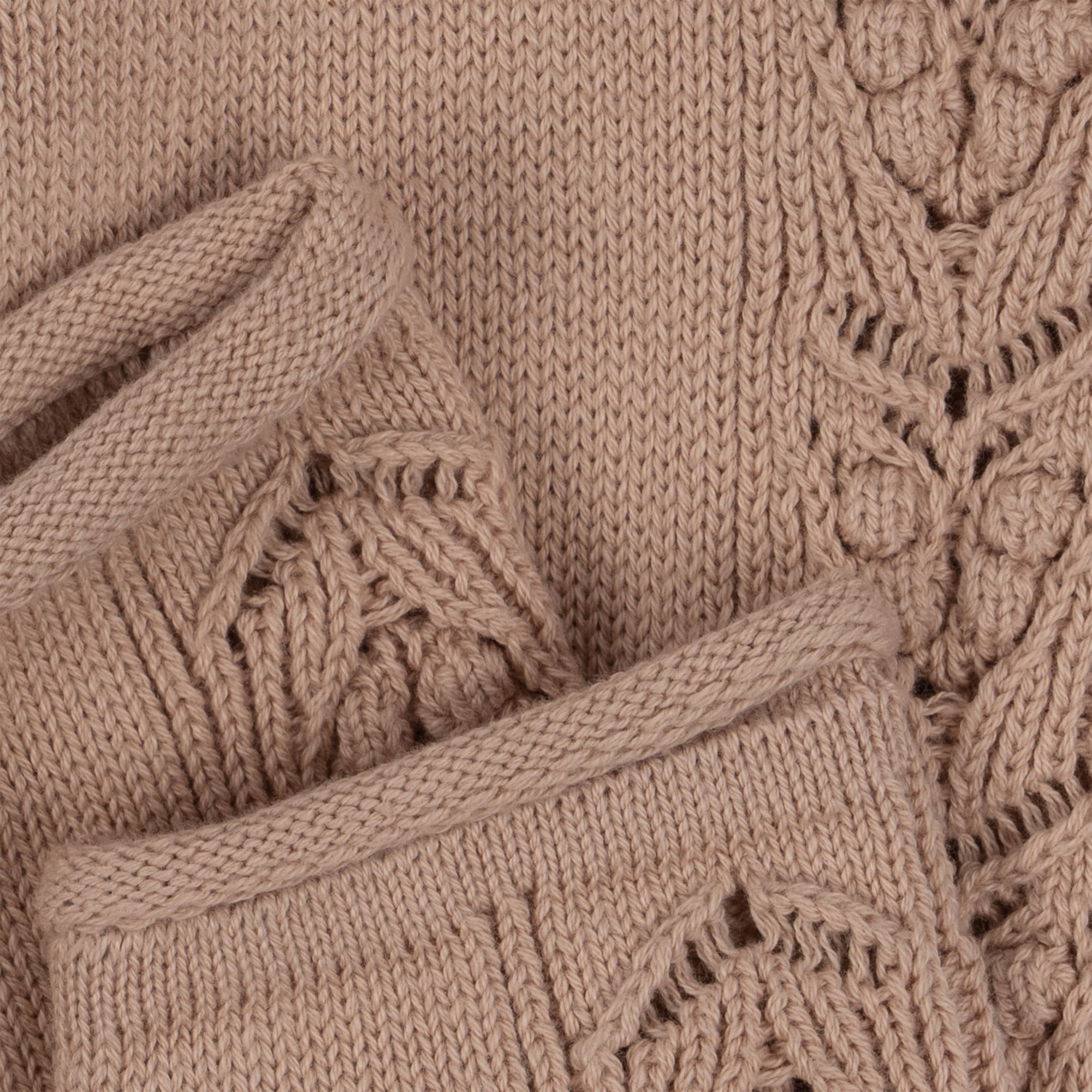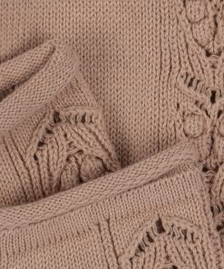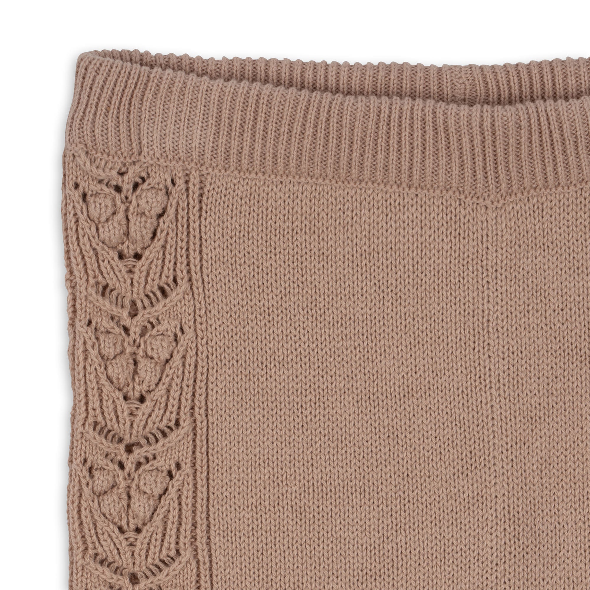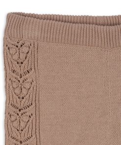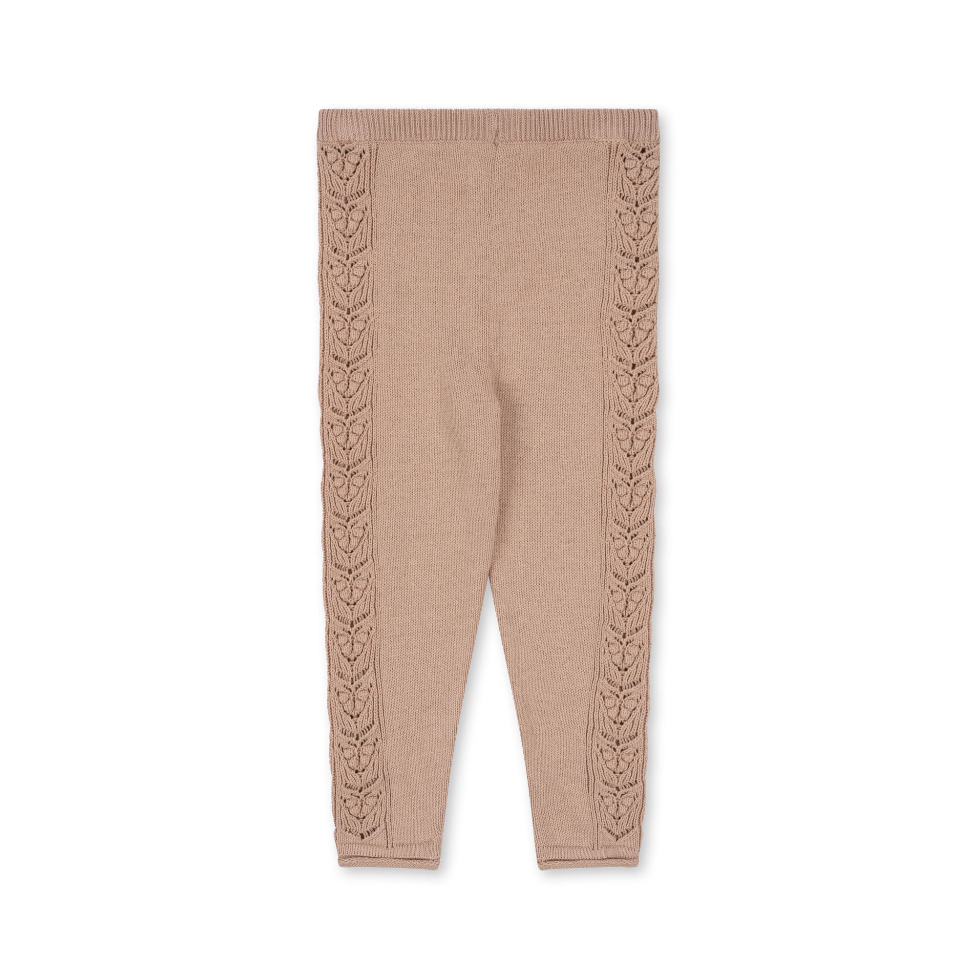 Soft knit pants with intricate knit patterns along the sides and an elastic waist.