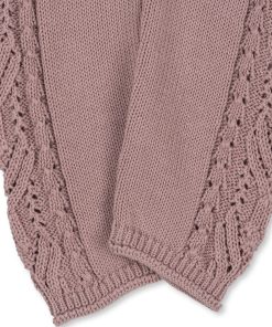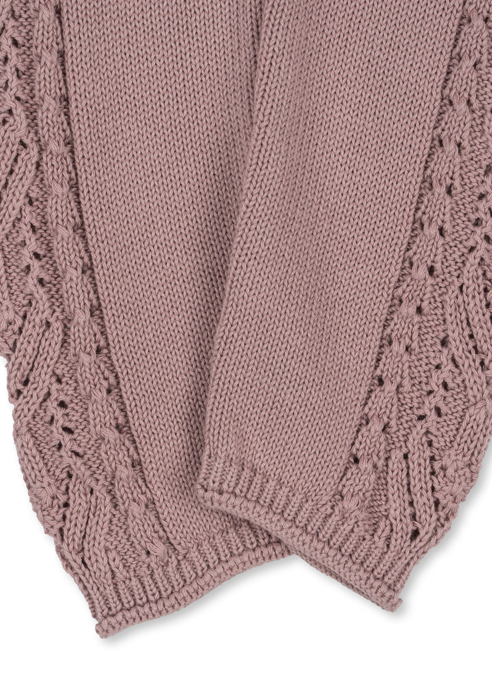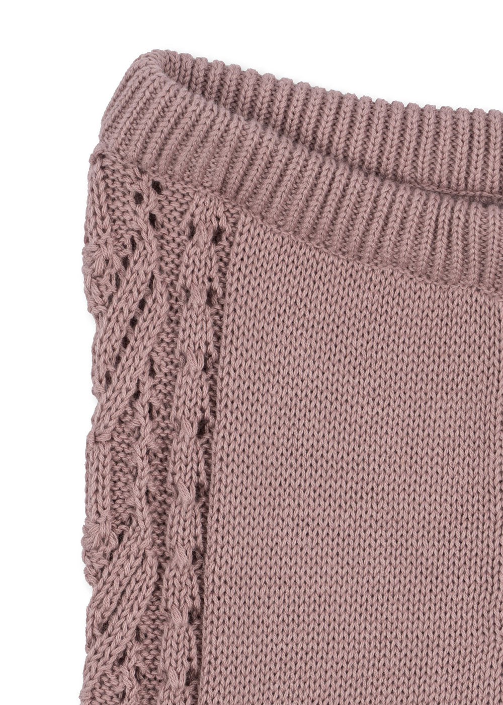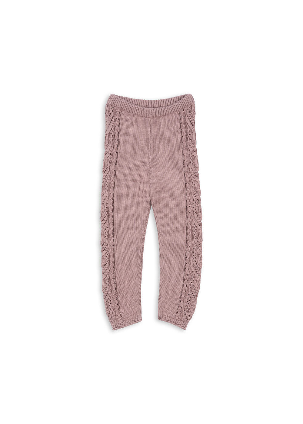 Knitted pants with intricate knit patterns along the sides and an elastic waist.