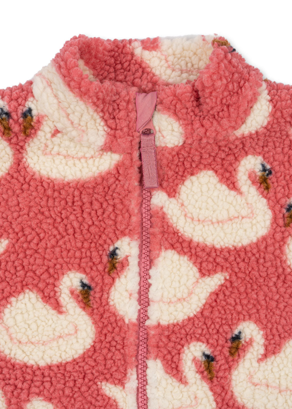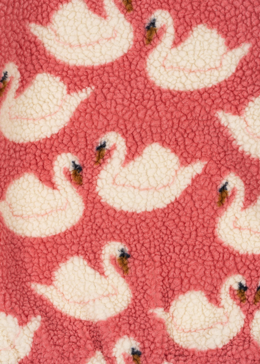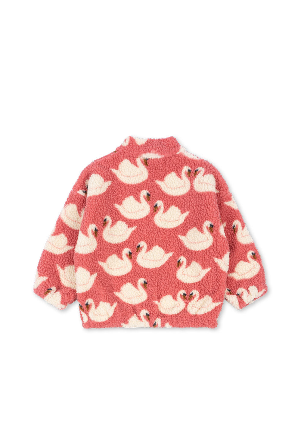 Warm pile jacket with soft and smooth inside fleece lining. Features a high collar and elasticated cuffs, and a full zipper closure in front that makes it easy to put on.